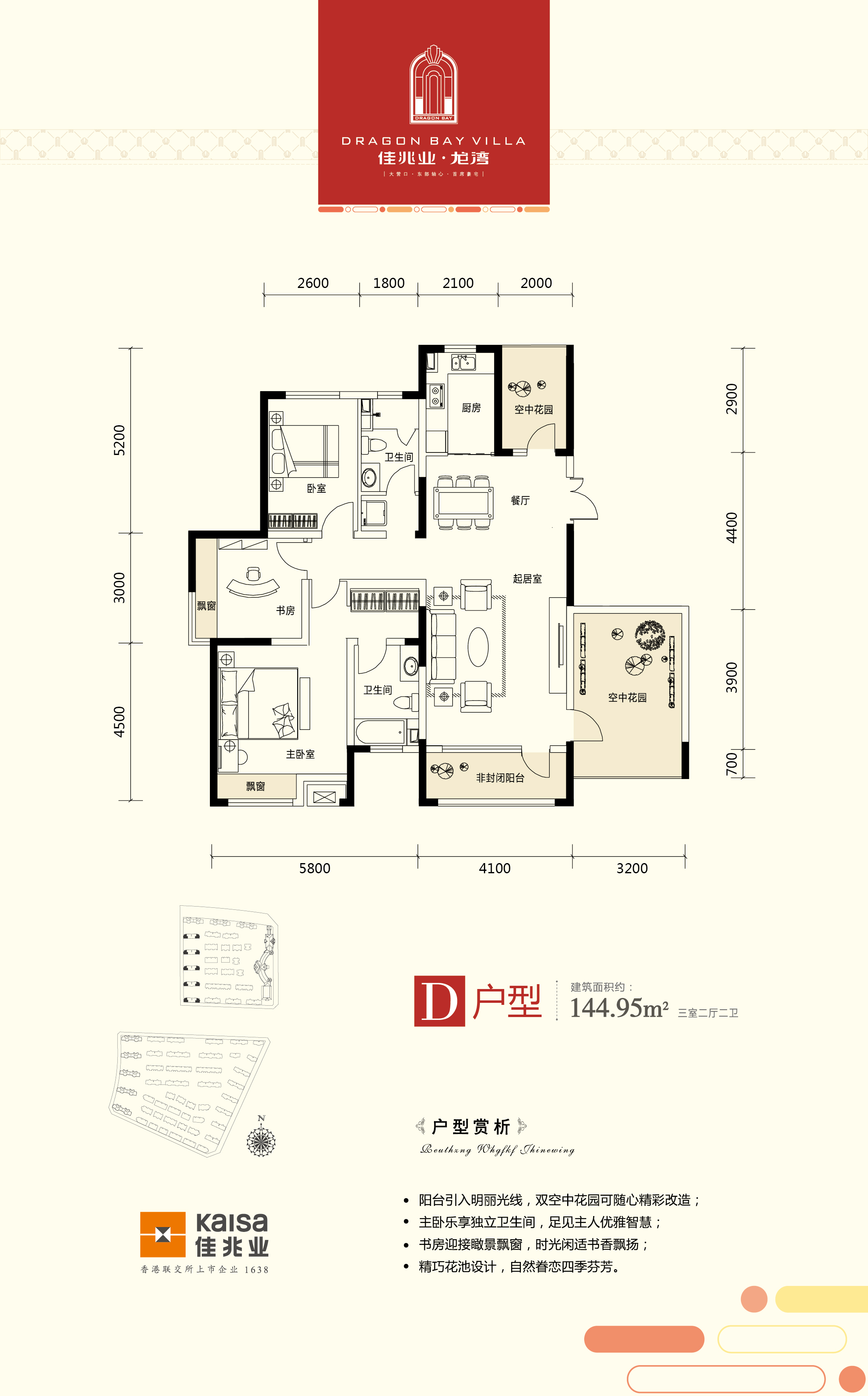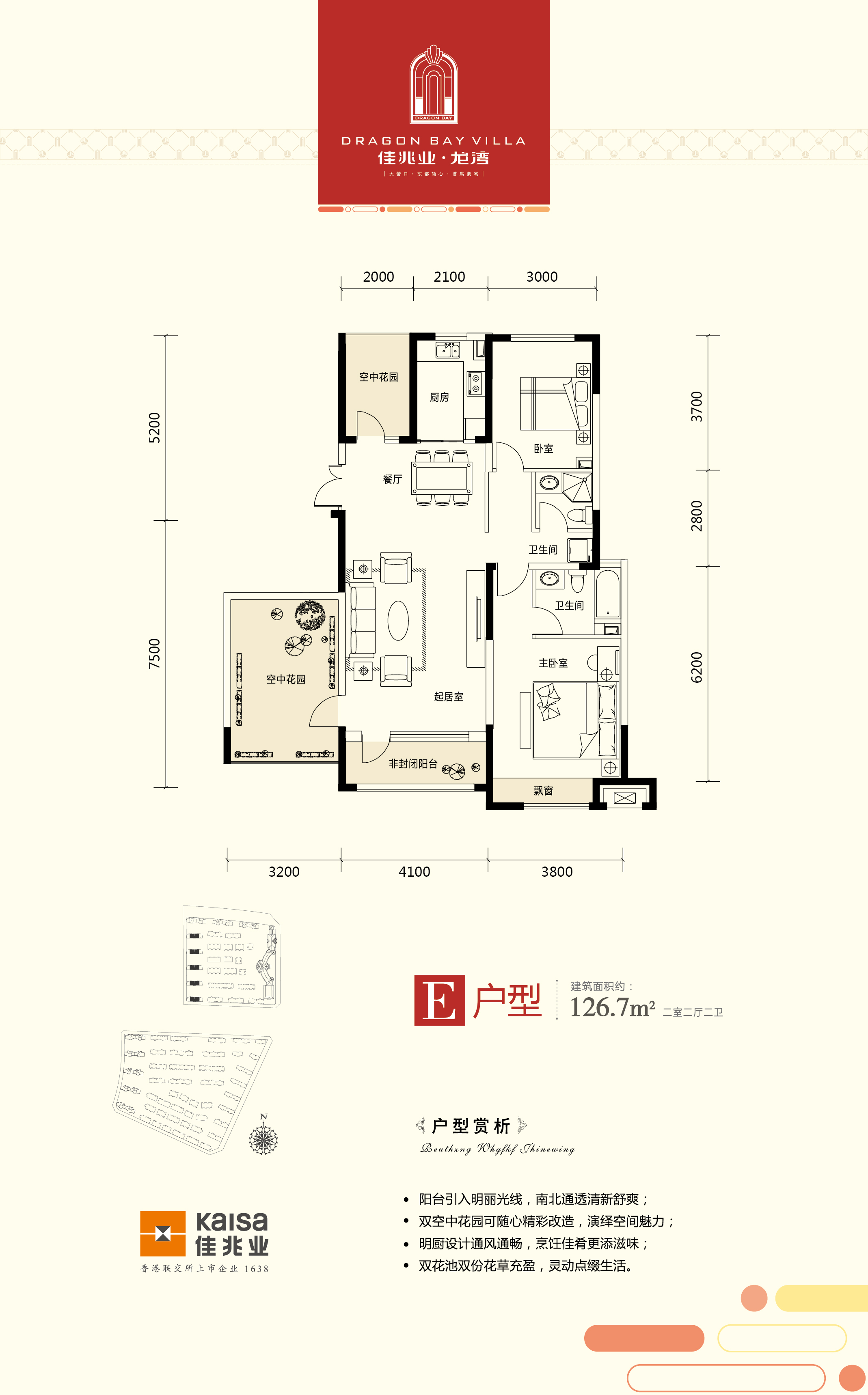 营口新城中心 城市奢华居所 佳兆业·龙湾位于渤海大街与新新路交汇处,是老边区中心之上的奢华生活场。该区域交通便捷,生态环境优美,人文气息浓郁。龙湾是佳兆业集团为营口名流精英量身定制的国际级高尚生活区,充满醇厚的新古典主义风情。项目整体的占地面积是47万平,总规划面积逾100万平,容积率1.33,绿地率30%。秉持佳兆业成熟的高端产品设计理念,龙湾建筑的规划、建筑选材、园林设计以及物业服务等方面都彰显出奢华优雅的艺术气质。未来龙湾璀璨落成后,将成为营口城市的地标性豪宅建筑群。 湿地公园之畔 滨湖豪宅生活区 龙湾外部紧邻湿地公园及中央景观湖,内部拥享22万平方米园林景观,自然滋养一派豪门生活。龙湾以世界的视野构建城市美学,植被、水景、木桥、广场、雕塑、灯光,处处散发灵性和生命的感动,每一细节都在谱绘城市新的居住文明。龙湾与大型购物广场、市民文化中心隔街相望,医院、学校近在咫尺。三横三纵的发达路网,实现与区域内各大交通干线及城市主要区域的高速对接,充分满足居者工作生活的出行需要。 在产品方面,龙湾规划了联排别墅、双拼别墅、花园洋房、小高层、高层及商业六大产品形态。联排别墅面积区间为220—260㎡,双拼为330㎡以上,花园洋房为103—260㎡,小高层为85—140㎡,高层为85—130㎡,建筑为异形柱、框架剪力墙结构,并基本做到了每单元2部电梯入户。楼间距达56米,保证建筑与阳光自由对话,视野开阔。空间的尺度与排布都体现出中坚阶层的审美情趣和高尚生活需求。 专属服务体系 名流精英 园区内近万平星级豪华会所,汇集国际标准篮球场、雪茄吧、网球馆、游泳池等多种功能设施,让居者随心锻炼,享受自在乐趣。佳兆业物业公司为国家一级物业管理资质的企业,荣获中国物业服务质量TOP10、中国物业服务百强企业、深圳具竞争力物管等众多殊荣。同时,龙湾先进的智能化安防系统,达到目前市场的配置水平。全方位的安全保障与贴心、周全的服务体系,让居者尽享轻松生活。